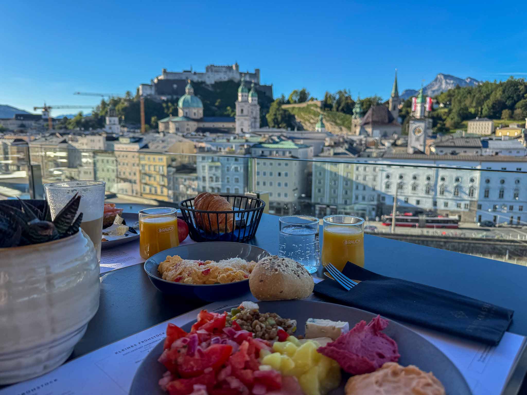Wo du übernachtest, macht in Salzburg echt einen Unterschied. Ich war im Hotel Stein direkt an der Salzach. Beim Frühstück schaust du auf die Festung und die Altstadt. Für mich war diese Aussicht eines der Highlights der ganzen Reise.