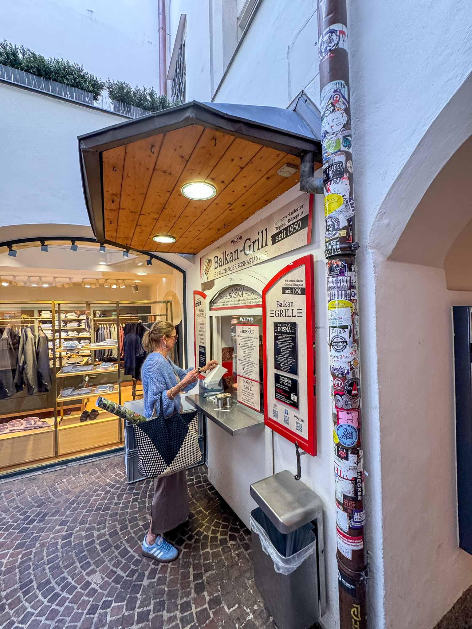 Jetzt wird’s lustig. Die Einheimischen haben in Salzburg einen ganz speziellen Triathlon erfunden: Bosna beim Balkan-Grill Walter essen, Eis in der Eisgrotte schlecken und zum Abschluss einen Schnaps beim Sporer trinken. Alles in der berühmten Getreidegasse. Salzburgs bekanntester Einkaufsstraße mit ihren schmiedeeisernen Zunftzeichen.